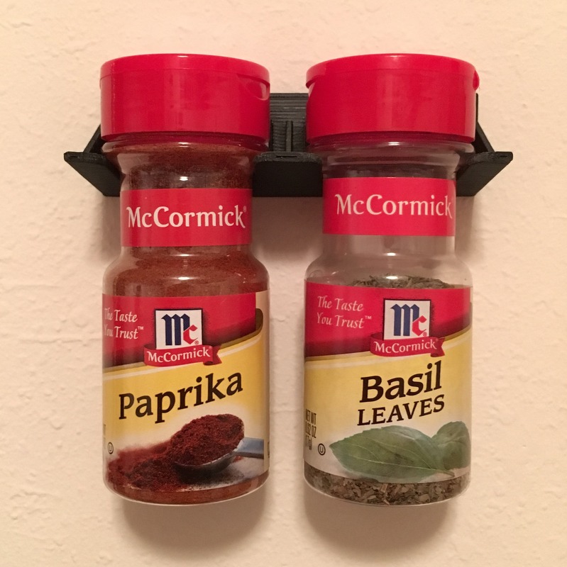 I designed this spice rack to hold 2 standard McCormick spice bottles by suspending them from the thin neck. The rack is attached to the wall by 2 nails - one through each corner of the rounded rectangular holes. This was printed in ABS at 0.2mm layer height.